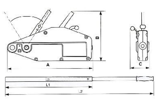 | 型號 | 額定載荷 | 額定載荷時手拉力 | 額定載荷時手柄往復(fù)一次鋼絲繩行程 | 鋼絲繩直徑 | 葫蘆重量 | 外形尺寸 |
